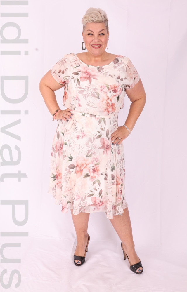 Trynite ekrü alapon beige virágmintás, kerek nyakú, derekán díszcsatos, muszlin anyagú, A-vonalú ruha.