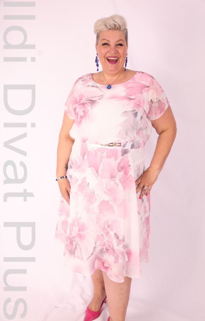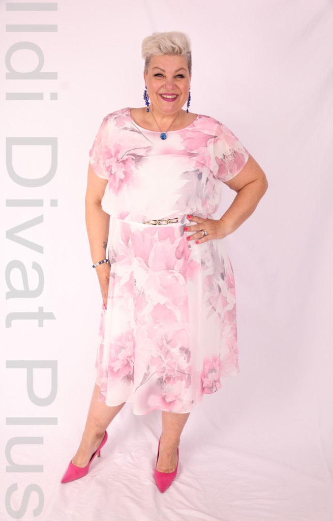 Trynite ekrü alapon rózsaszín virágos derekán szabott A vonalú muszlin ruha.