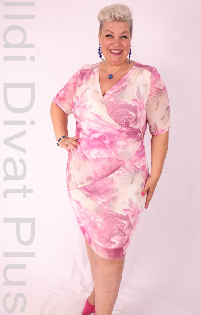 Trynite ekrü alapon rózsaszín virágos derekán húzótt mellén átlapolt hálós anyagú ruha.