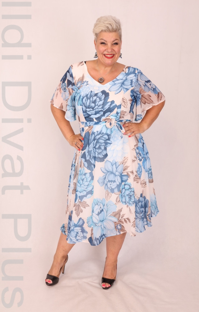 Trynite ekrü-kék virágmintás, V-kivágott, lepke ujjú, derekán megkötős, A-vonalú ruha.