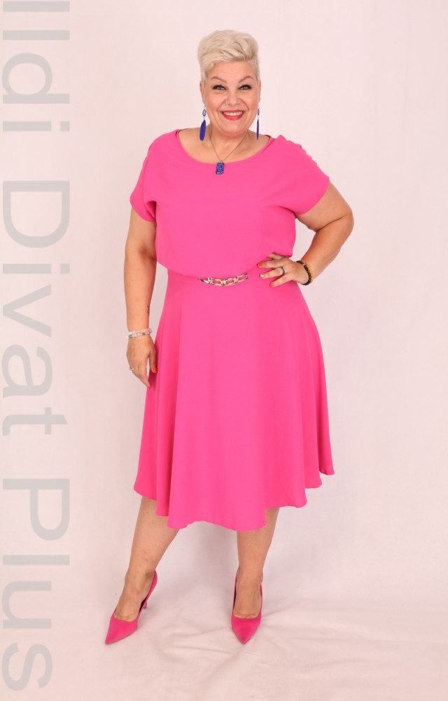 Trynite pink színű, kerek nyakú, muszlin anyagú, derekán díszcsatos, felső részén lezser fazonú, A-vonalú ruha.