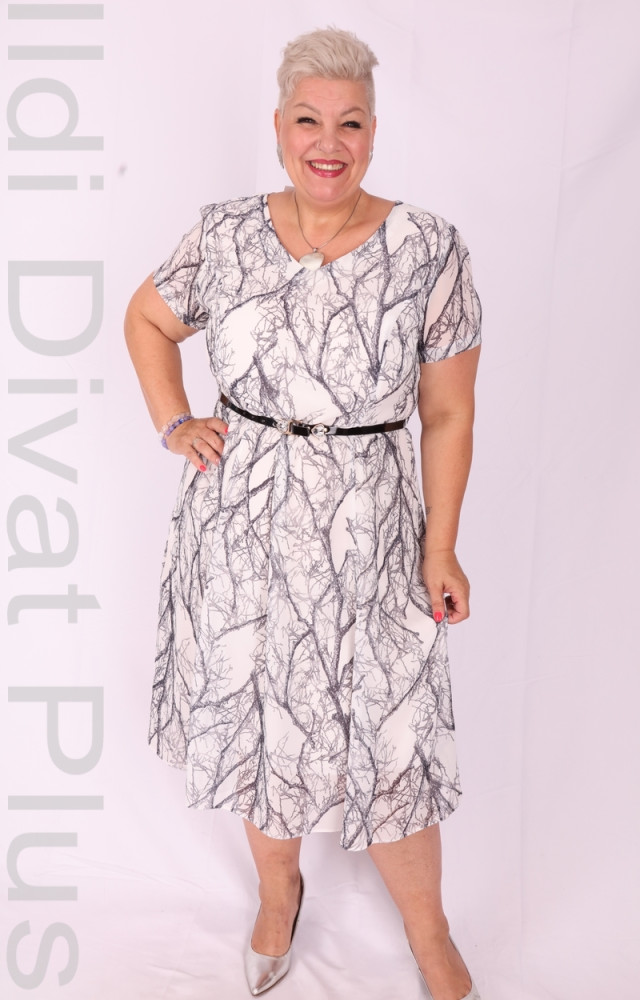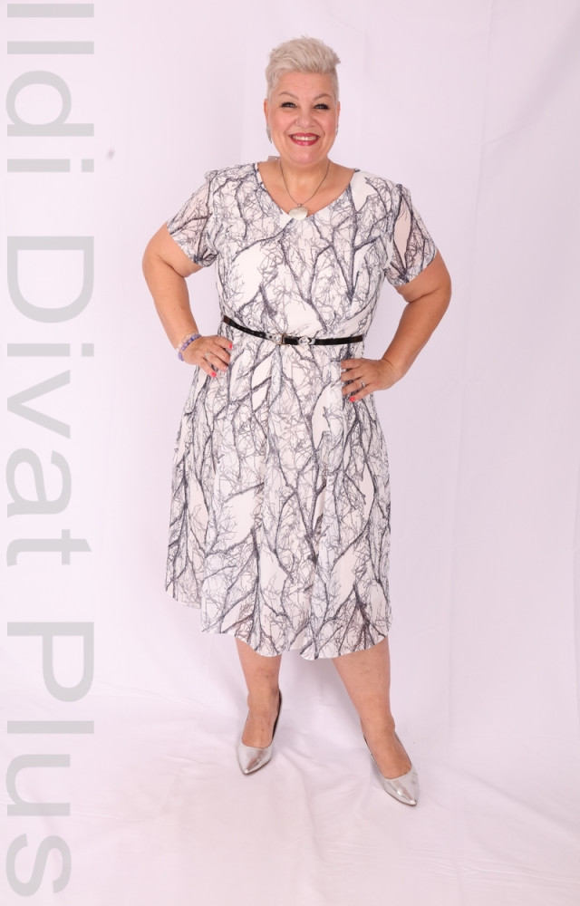 Trynite fehér alapon szürke-arany mintás, V-kivágott, derekán öves, lefelé bővülő fazonú ruha.