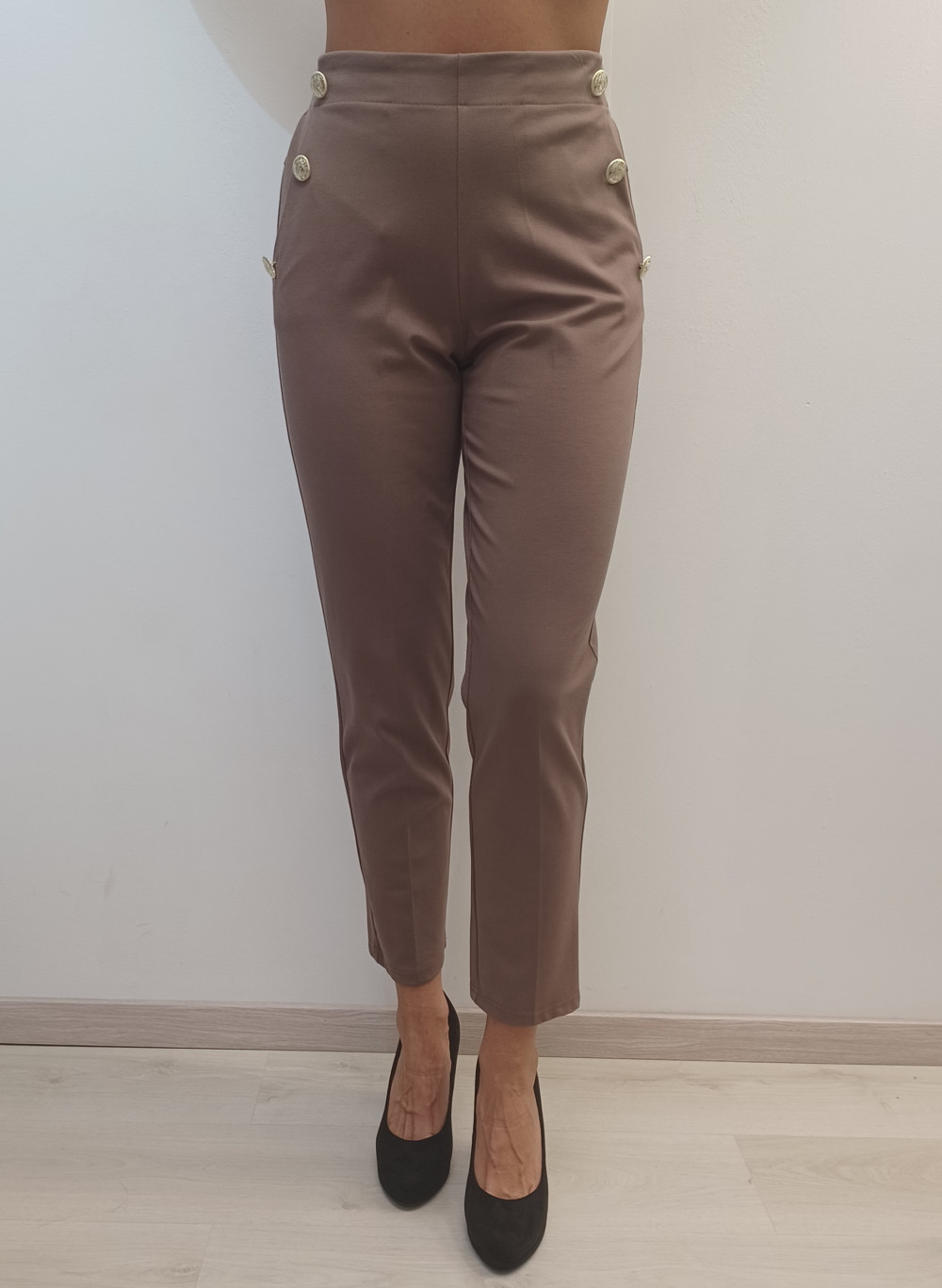 Drapp színű, arany gombos, hátul derék részen gumis nadrág.