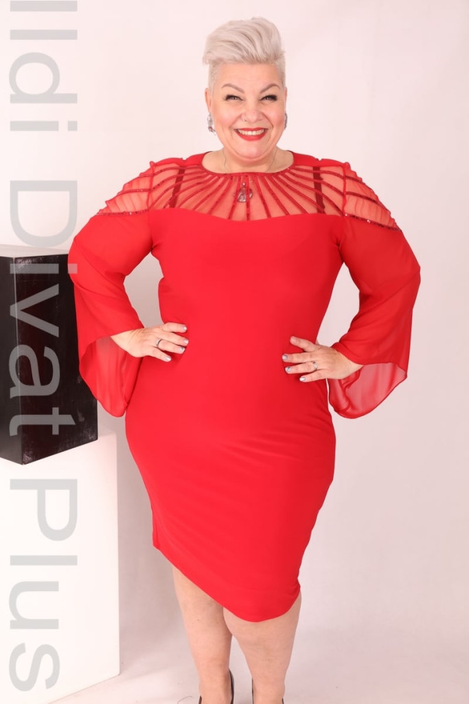 Verda bordó színű, nyak részén neccbetétes, karcsúsított fzonú ruha.