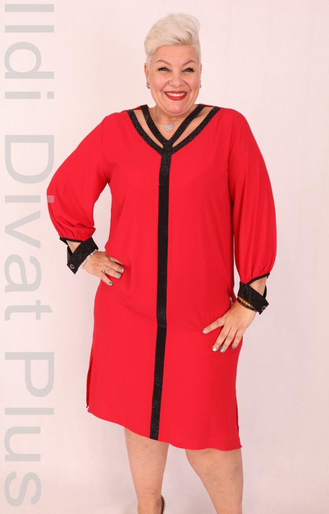 ViaVia piros-fekete színű, V-kivágott, nyak részén és ujja végén nyitott, egyenes fazonú ruha.