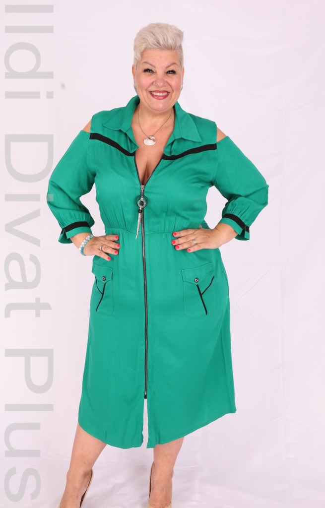 Zöld-fekete betétes elején zippes vállán kivágott deréban szabott A vonalú ruha.