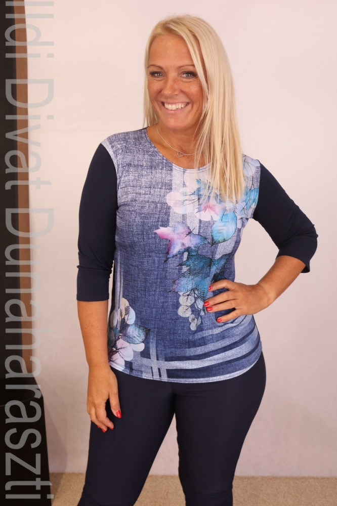Yes kék alapon virágmintás, kerek nyakú, egyenes fazonú felső.
