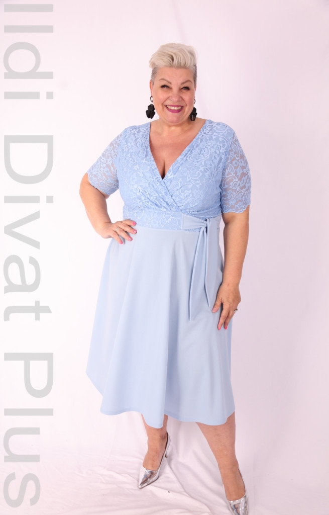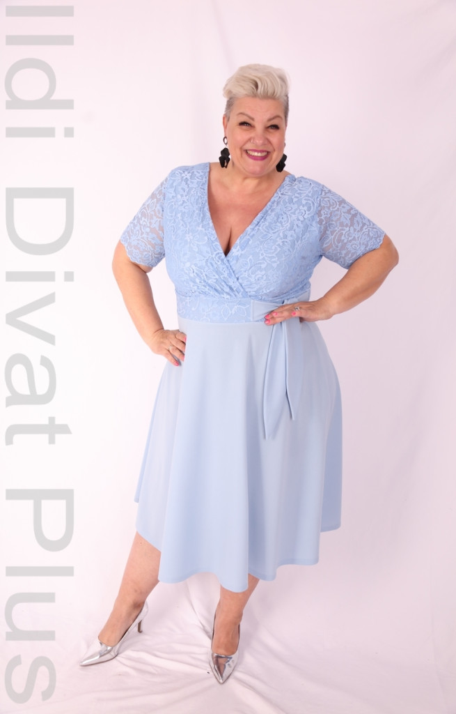 Zita babakék színű, V-kivágott, mell részén csipkés és átlapolt, derék részén megkötős, A-vonalú ruha.