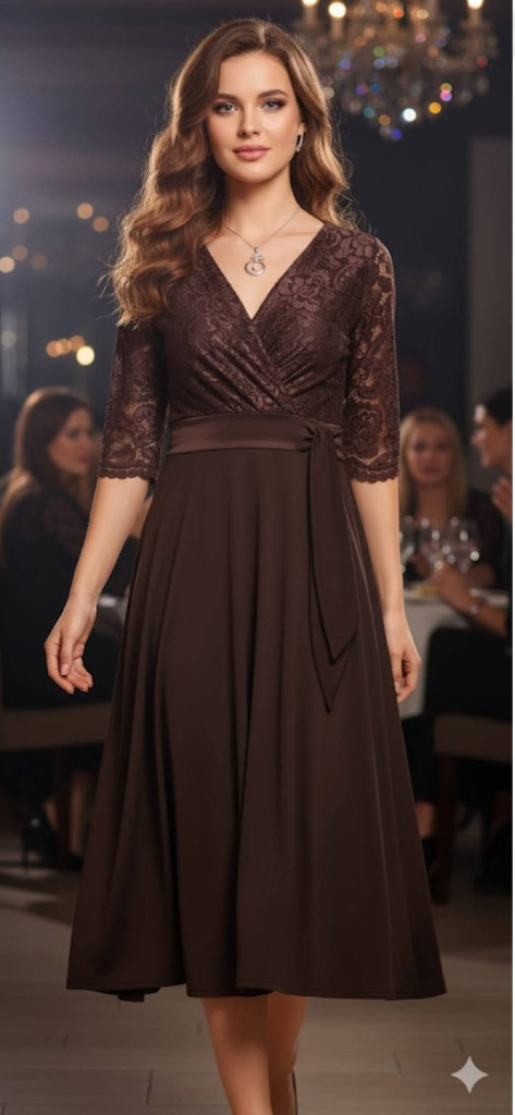 Zita barna 3/4 ujjú csipkés tetejű A vonalú ruha.