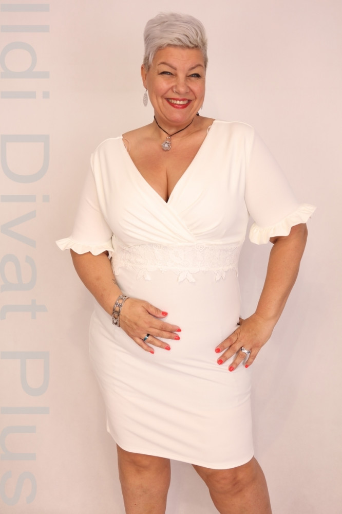Zita fehér színű, V-kivágott, mell részén átlapolt és húzott, csipkés, karcsúsított fazonú ruha.