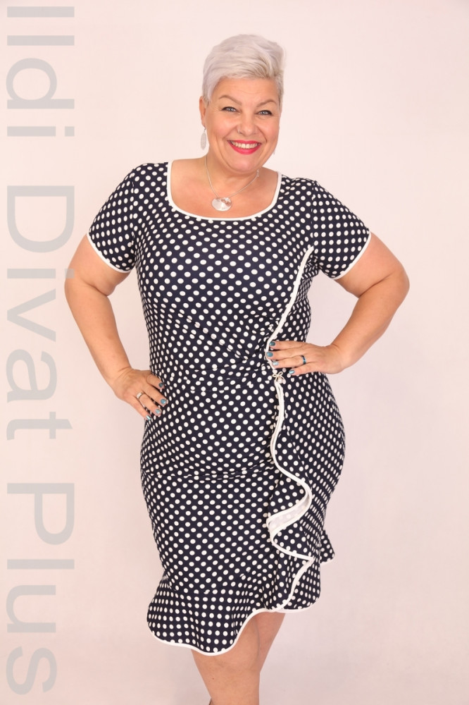 Zita sötétkék-fehér színű, elején fodros, karcsúsított fazonú ruha.