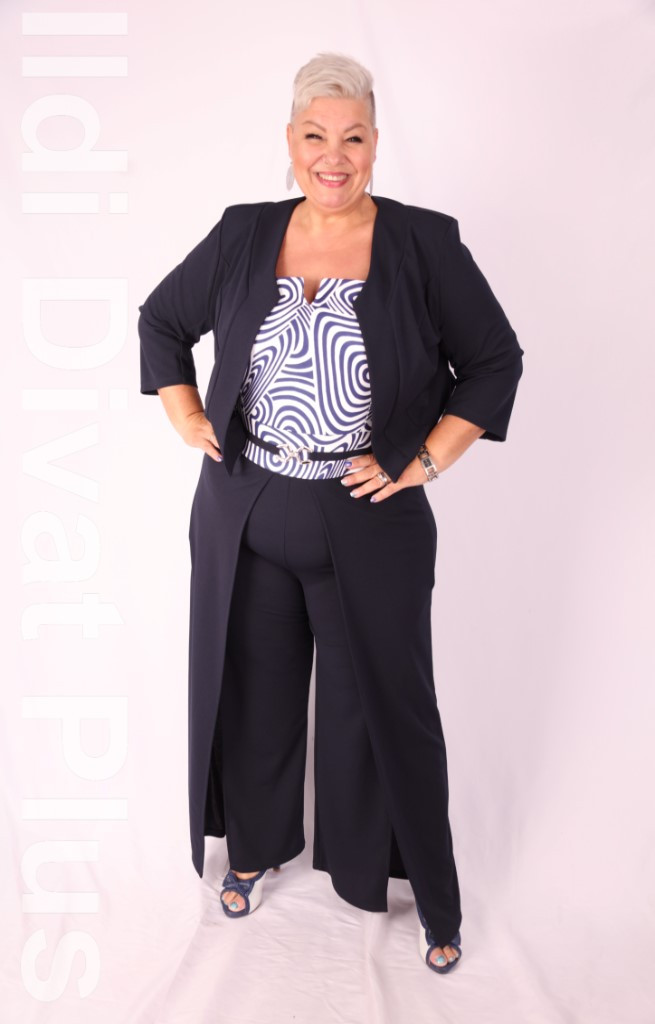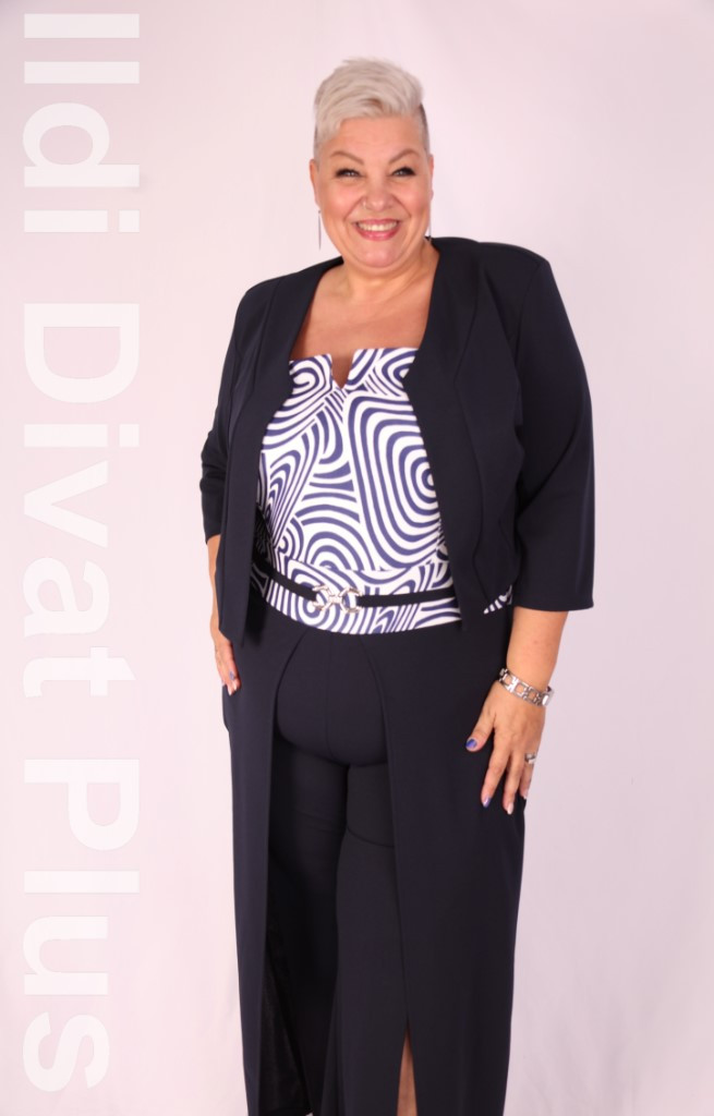 Zita sötétkék alapon fehér mintás overál + kék boleró.