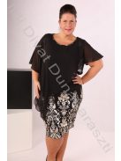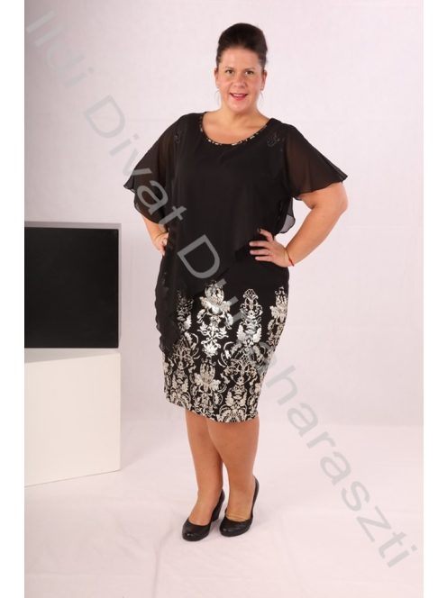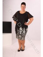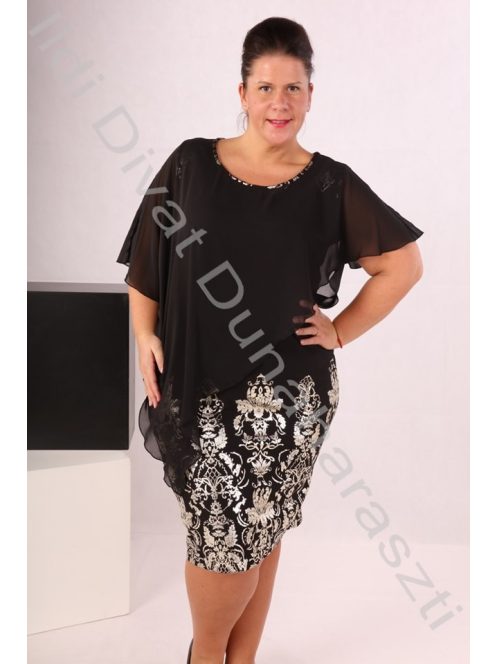 Zita fekete színű, arany mintás, kerek nyakú, muszlin rátétes, karcsúsított fazonú ruha.