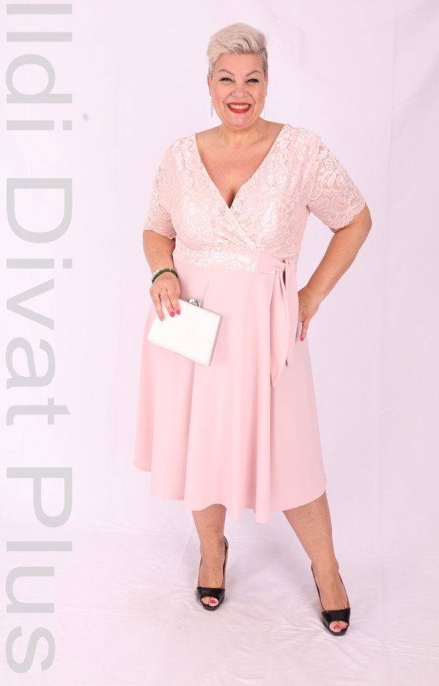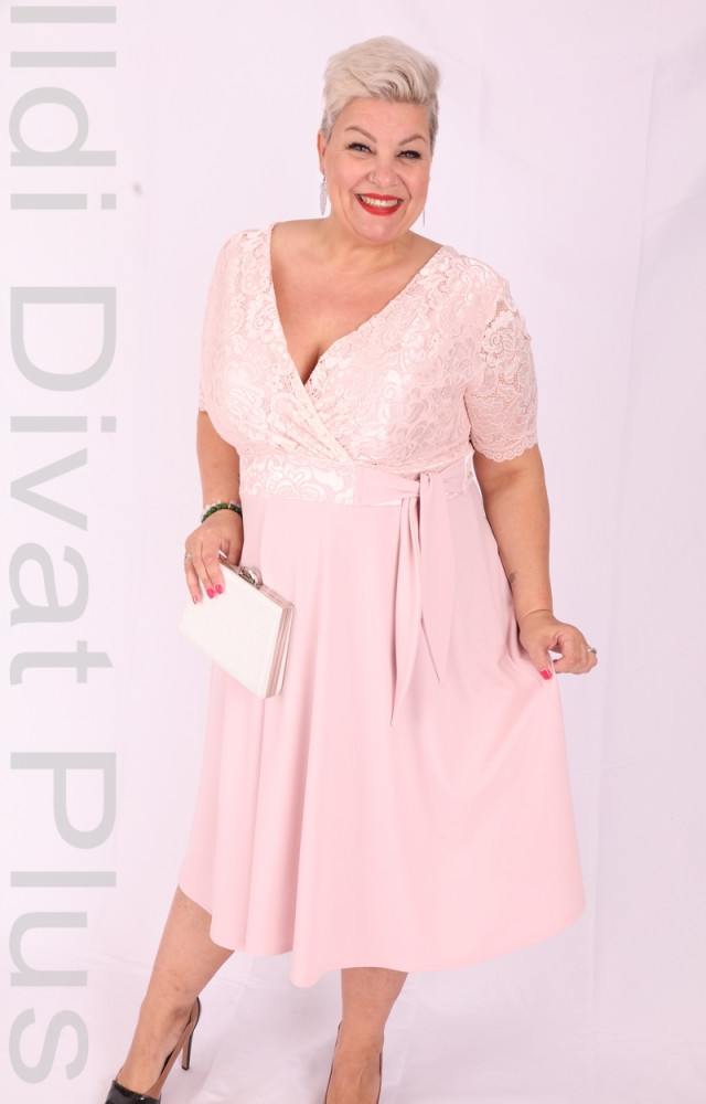 Zita púder színű, mell részén csipkés átlapolt, derekán megkötős, A-vonalú ruha.