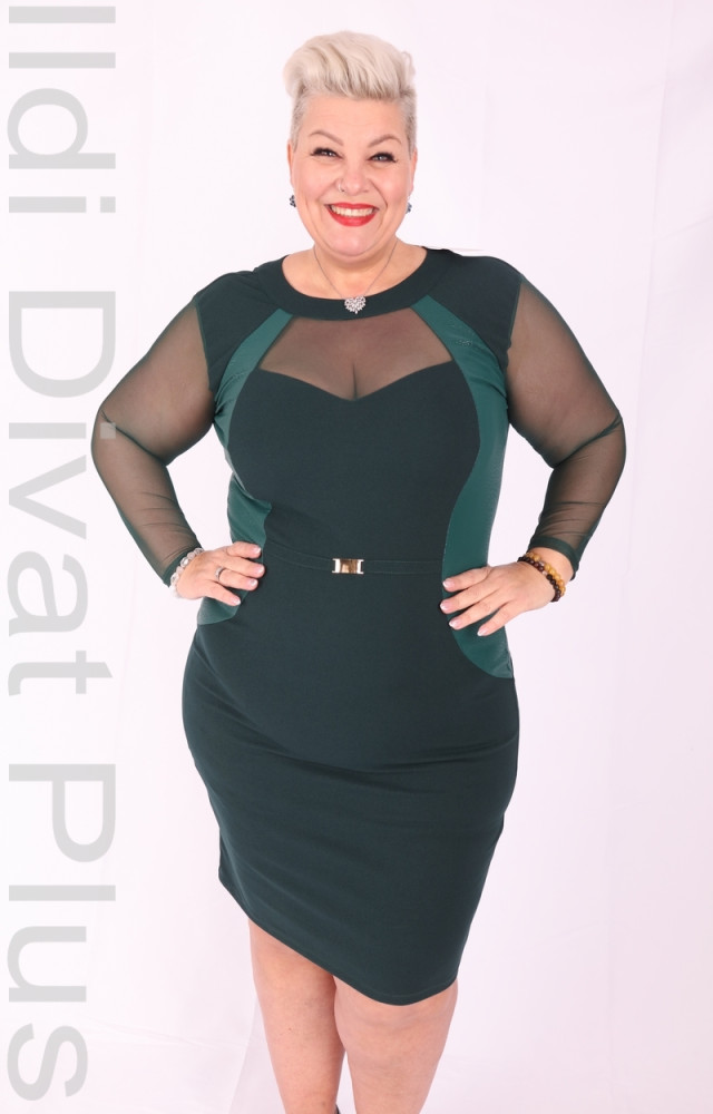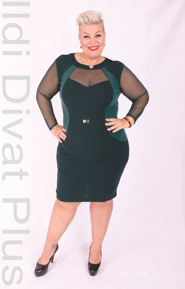 Zita smaragdzöld színű, ujján és nyak részén necces, műbőr betétes, derék részén díszcsatos karcsúsított fazonú ruha.
