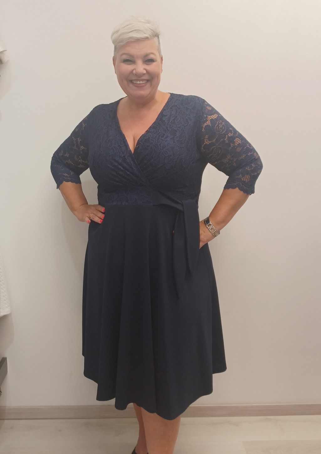 Zita sötétkék 3/4 ujjú csipkés tetejű A vonalú ruha.