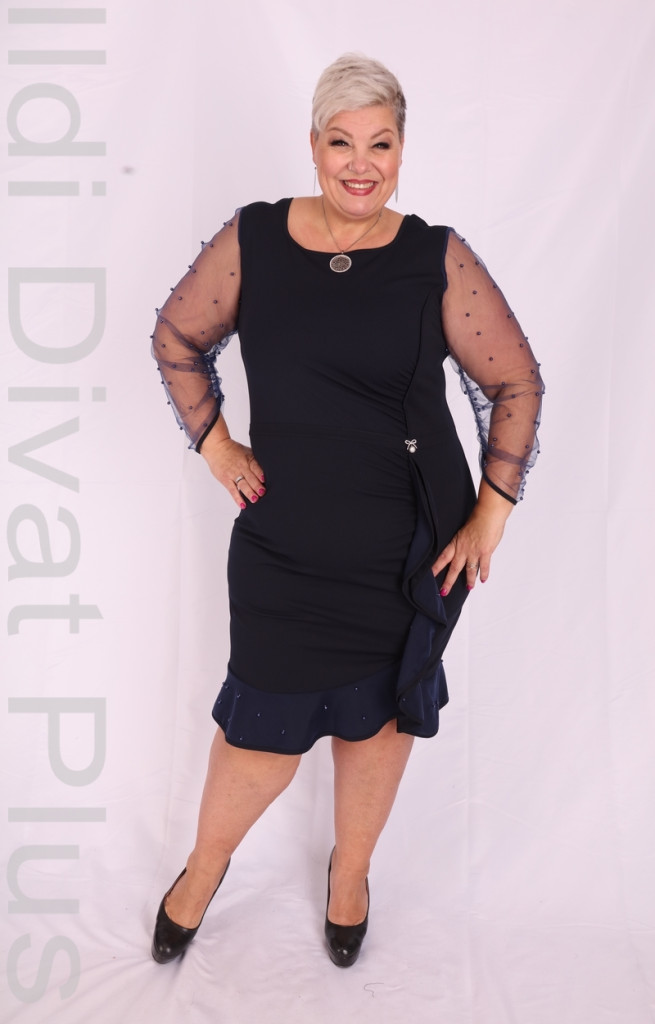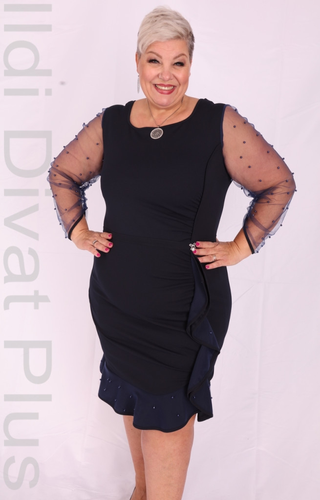 Zita Sötétkék fodros ujján gyöngyös alkalmi ruha.