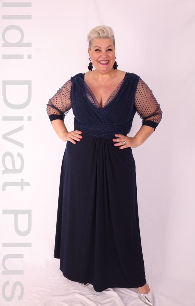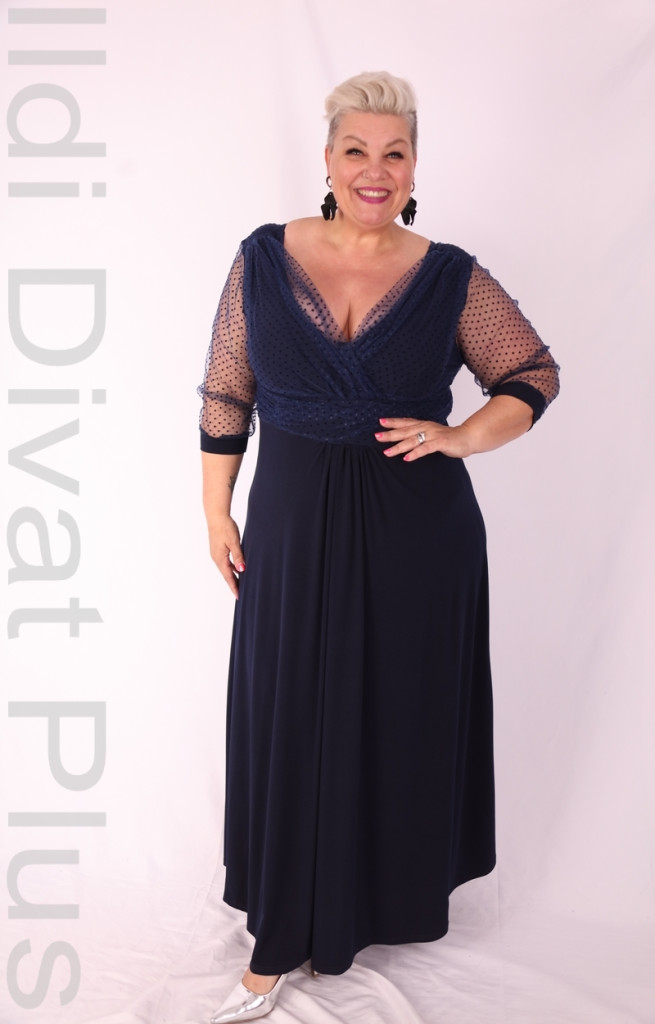 Zita sötétkék pöttyös necces mellén átlapolt derekán szabott A vonalú maxi ruha.