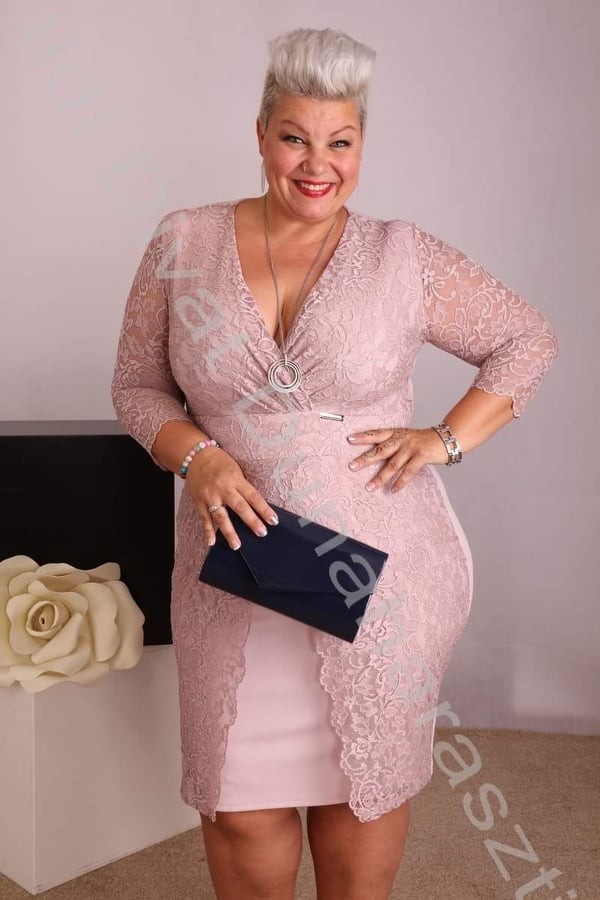 Zita mályva színű, V-kivágott, csipkés, mell részén átlapolt, alsó részén nyitott, karcsúsított fazonú ruha.