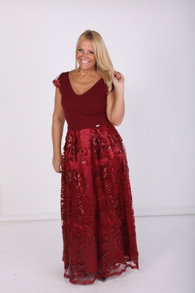Mystic Day bordó színű szoknya részén flitter díszítéses necces-csipke, V-kivágott, A-vonalú,maxi ruha.