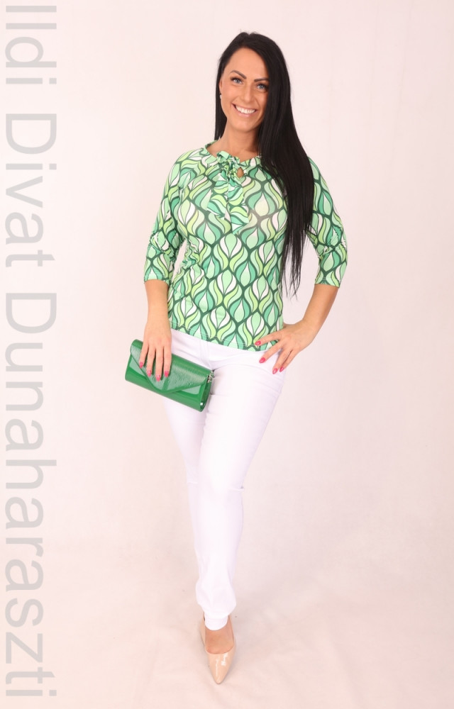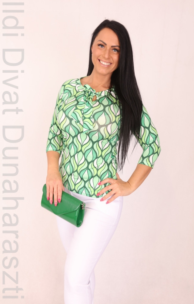 Manda Collection zöld-ekrü mintás, kerek nyakú és kötős, karcsúsított fazonú felső.