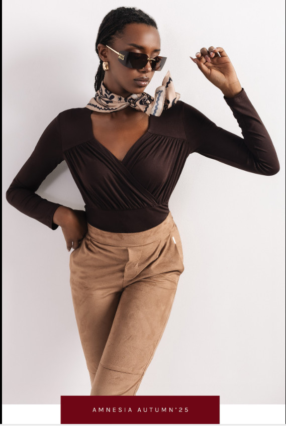 Az AMNESIA Valona felső a nőies, őszi szettek tökéletes alapja. Puha viszkózból készült, amely finoman követi a test vonalát, így egyszerre biztosít kényelmes viseletet és kifinomult megjelenést. A bordázott vállrésznél lágy ráncolás ad játékos karaktert, míg az átlapolt V-kivágás klasszikus, de modern hatást kelt. Az egyméretű fazon tökéletesen illeszkedik különböző alkatokra, így igazán univerzális darab.