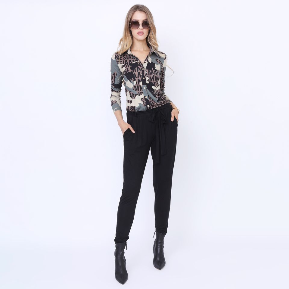 Amnesia felül terepmintás alul fekete színű,gombos,galléros,derekán kötős mindennapi overál.