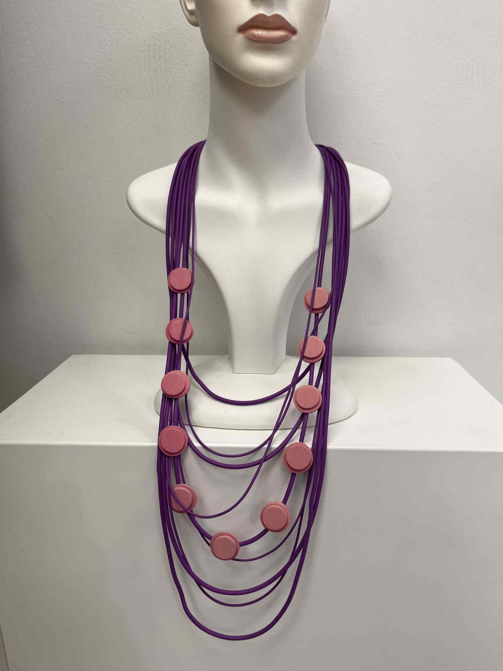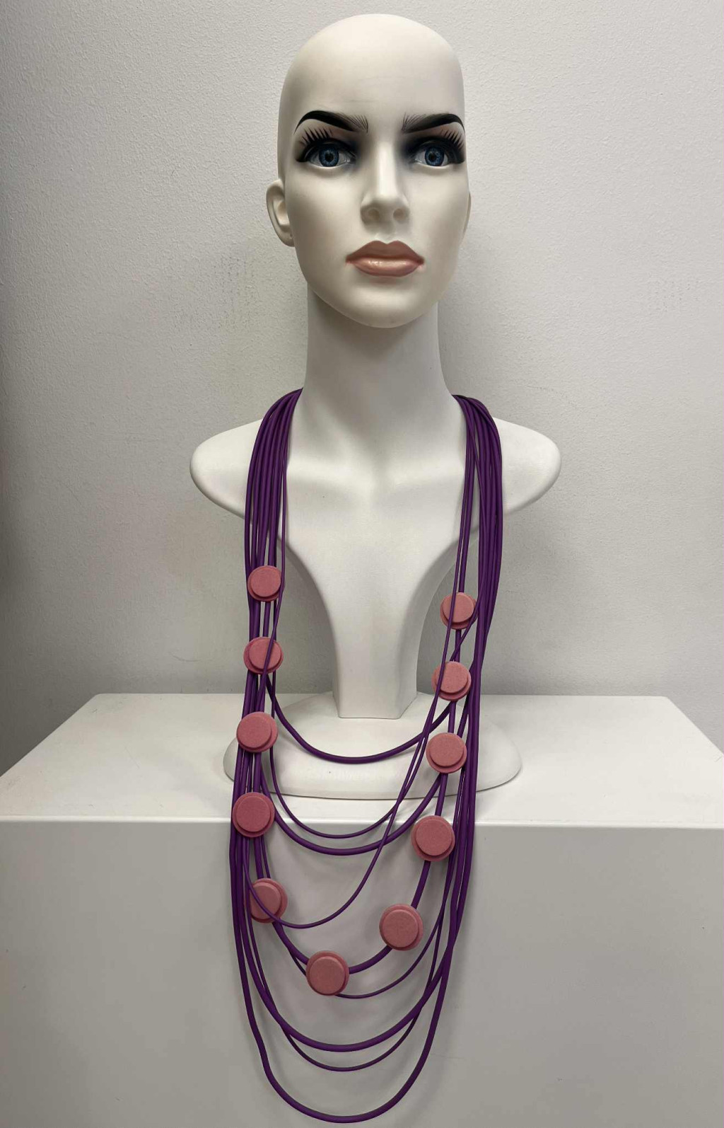 Lila hoszított gombos nyakán mágneses bizsu lánc.