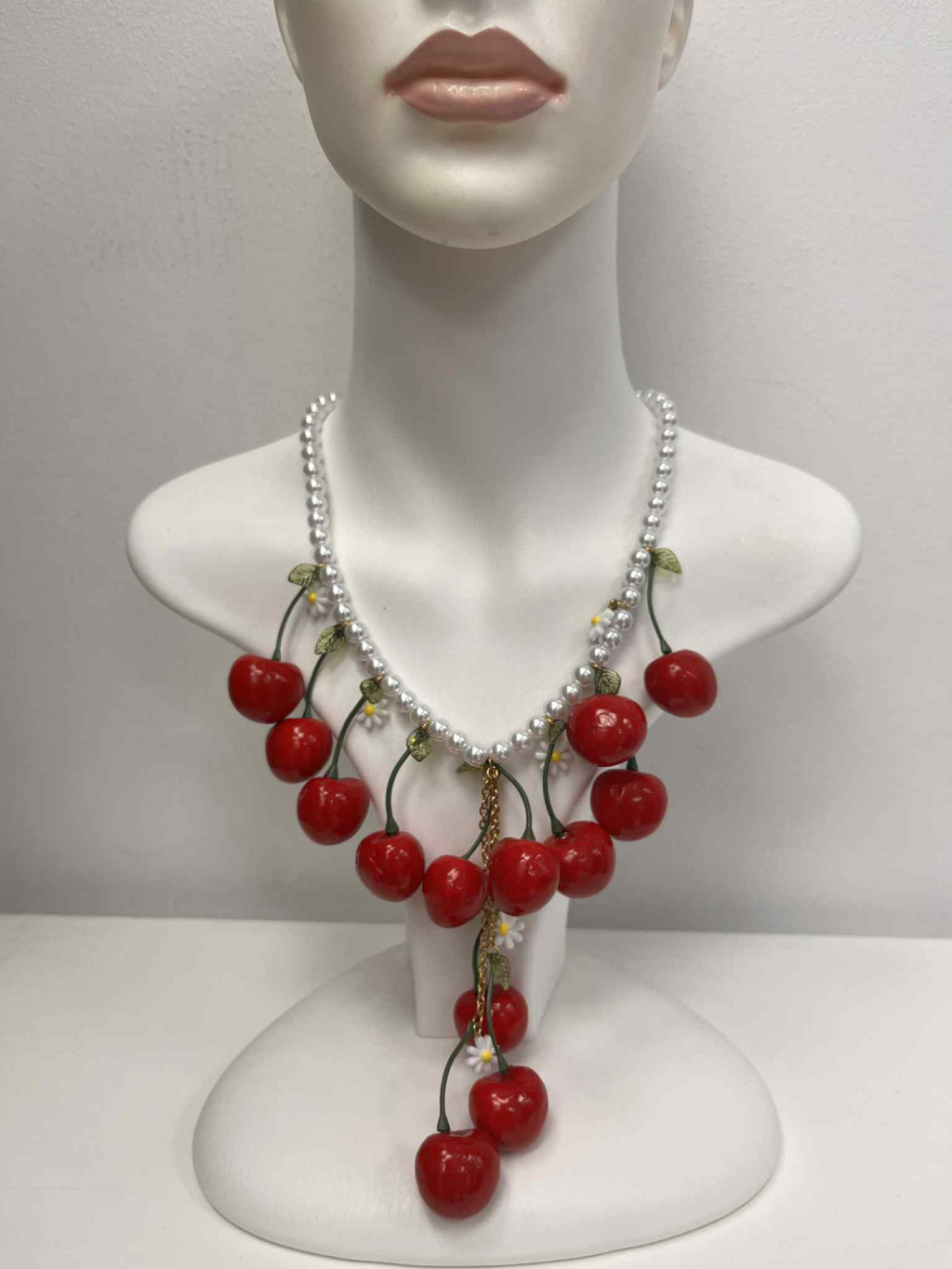 Fehér gyöngyös piros cseresznyés bizsu lánc.