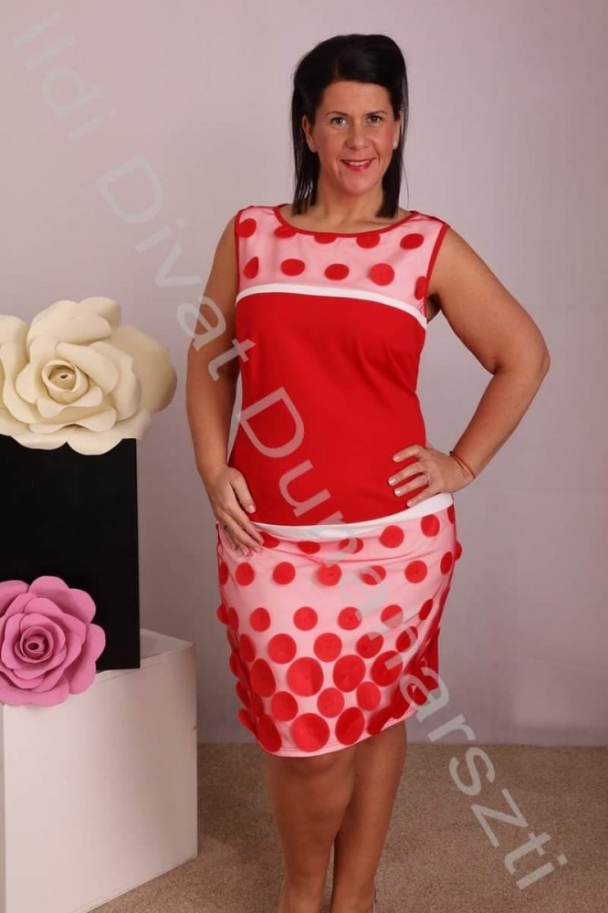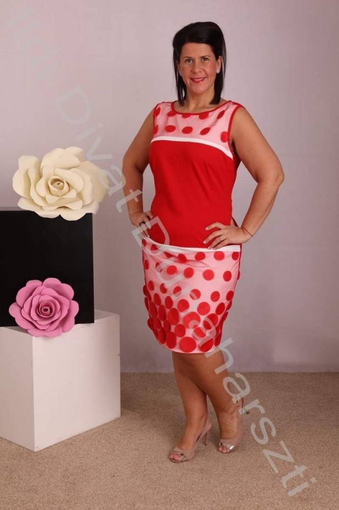 Crafty Clothes piros-fehér színű, pöttyökkel díszített, karcsúsított fazonú ruha.
