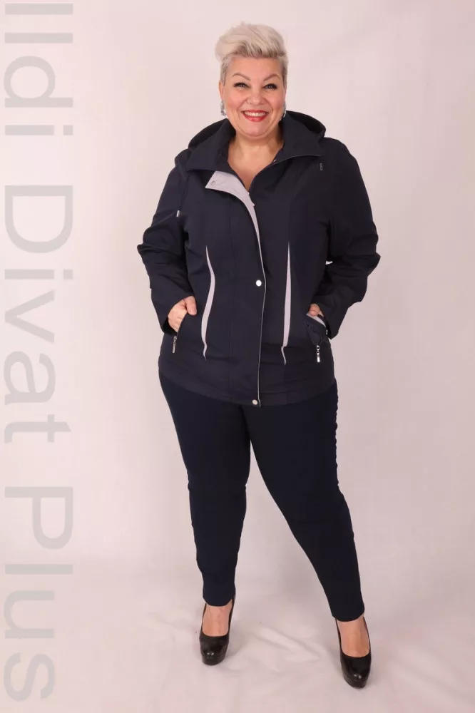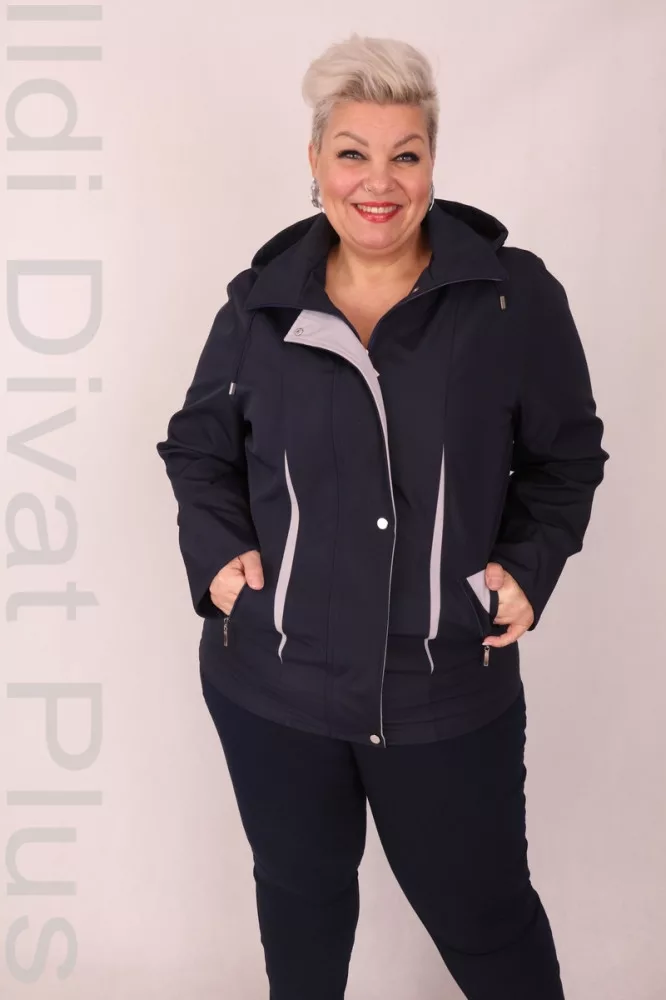 Sötétkék-szürke színű, kapucnis, cipzáras, átmeneti kabát.