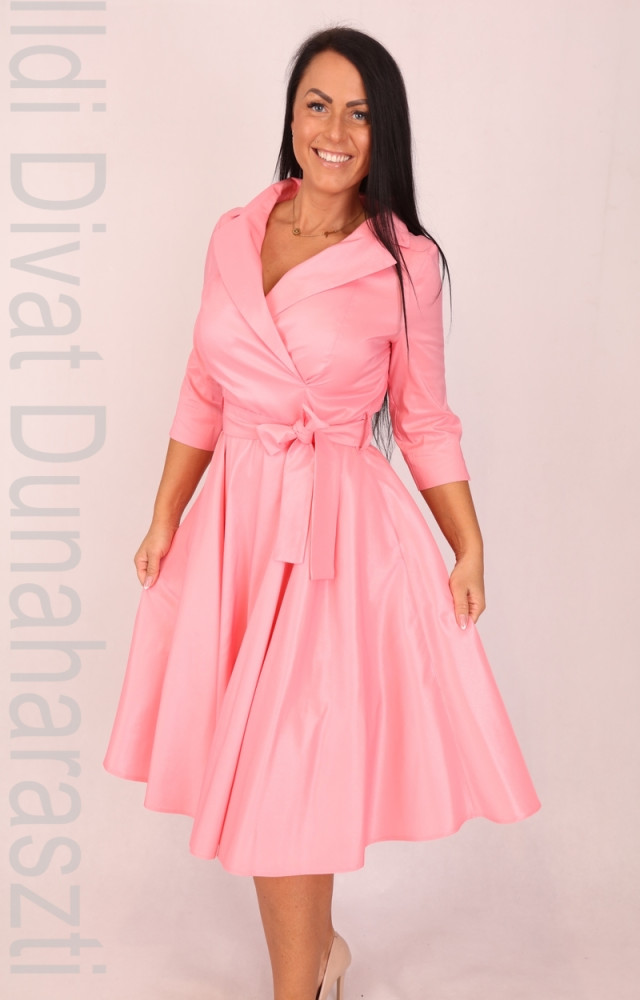 Margo rózsaszín színű, galléros, zsebes, derekán megkötős, A-vonalú ruha.