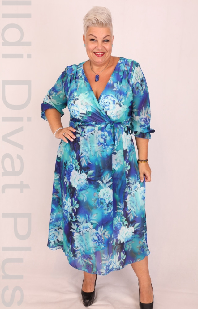Monariss királykék-zöld virágmintás V-kivágott és átlapolt, muszlin anyagú, derekán megkötős, A-vonalú ruha.