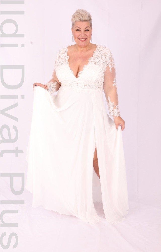 Pretty Woman fehér színű, V-kivágott, tetején csipkés, necces ujjú, sliccelt, A-vonalú ruha.