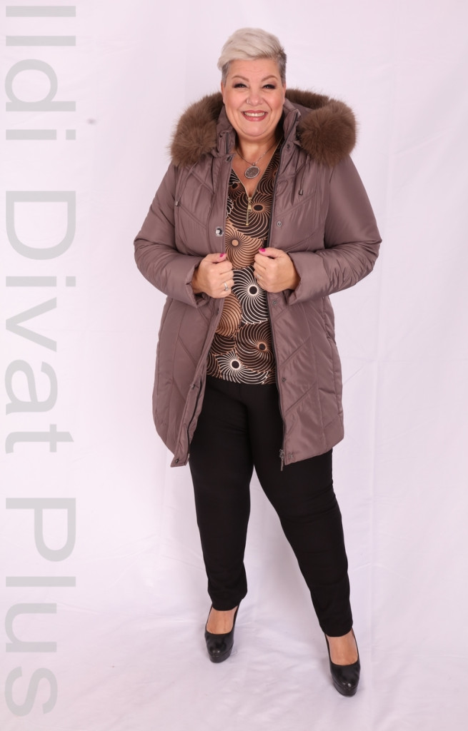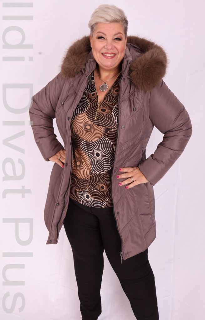 A Incze barna színű, kapucnis, levehető szőrmés, cipzáras, karcsúsított fazonú téli kabát.