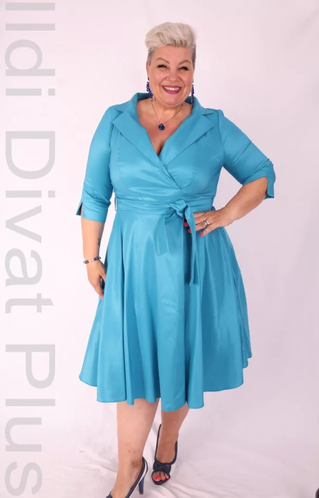 Margó türkiz csillogós anyagú derekán szabott A vonalú alkalmi ruha.