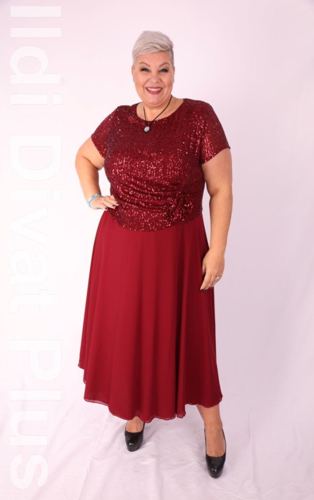 Elli Bordó színű, V-kivágott, felső részén flitteres, , alsó részén muszlin anyagú, enyhén lefelé bővülő fazonú alkalmi maxi ruha.