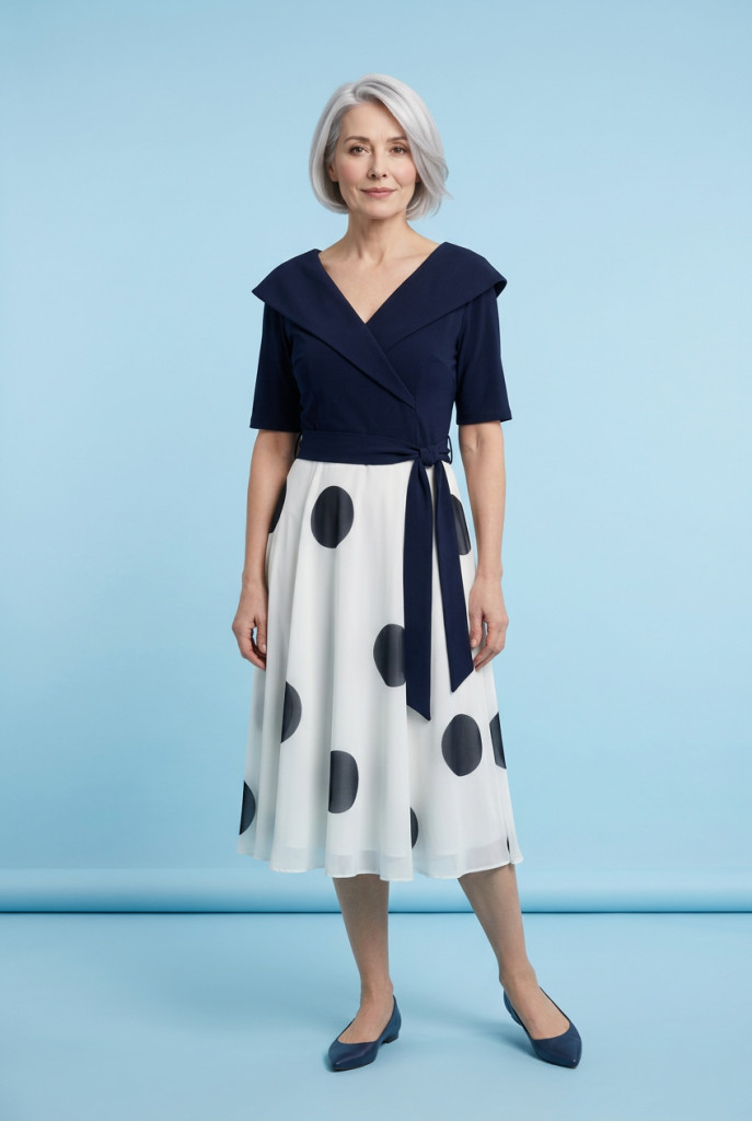 Benitta kék-fehér pöttyös derekán szabott A vonalú ruha.