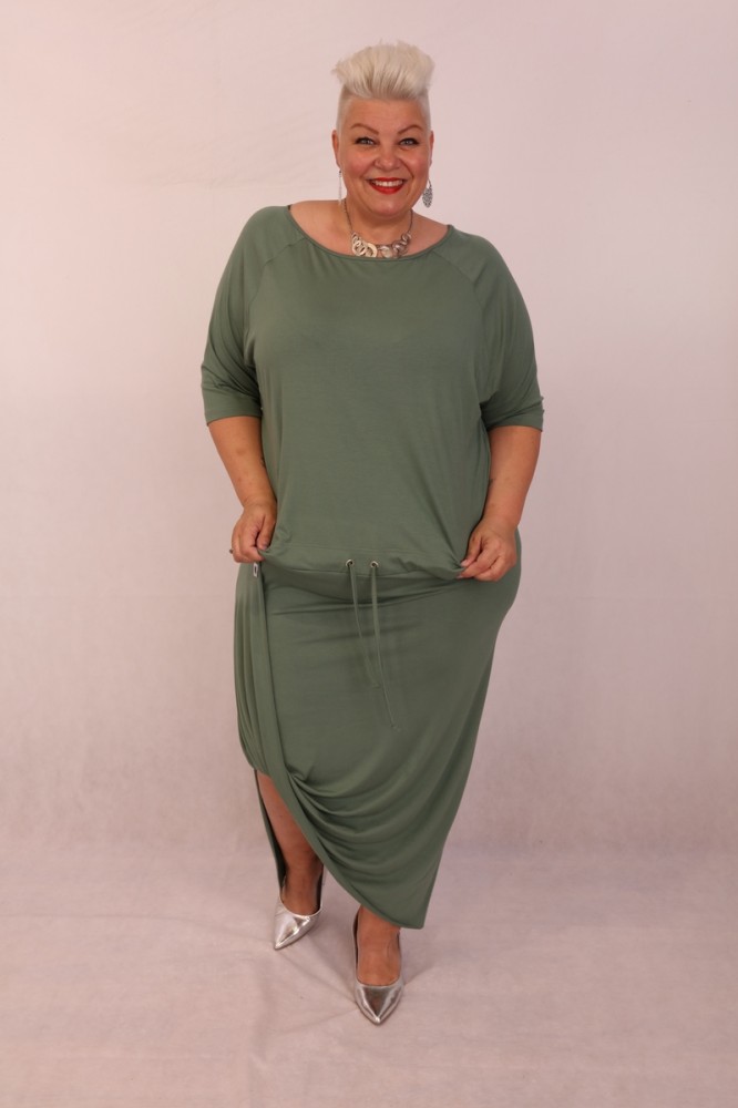 Caremo keki színű, kerek nyakú, derék részén behúzós és megkötős, alján aszimmetrikus, lezser fazonú ruha.