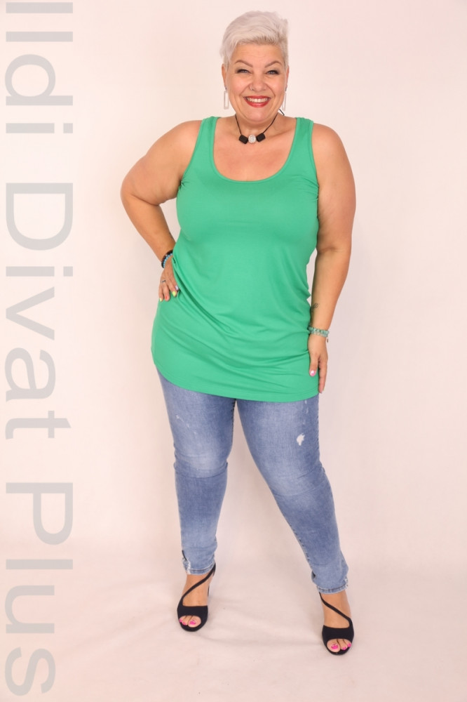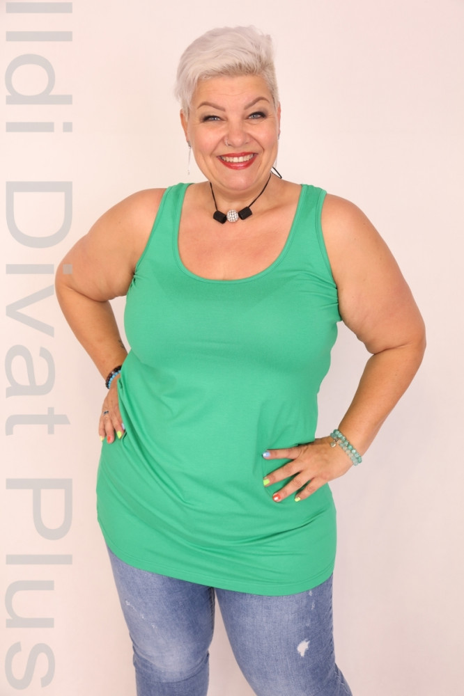 Caremo zöld színű, kerek nyakú, vastag pántos, hosszított fazonú trikó.