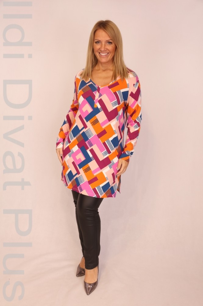 Caremo színes mintás, ujja végén passzés, oldalán sliccelt, egyenes fazonú tunika.