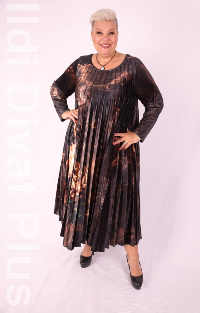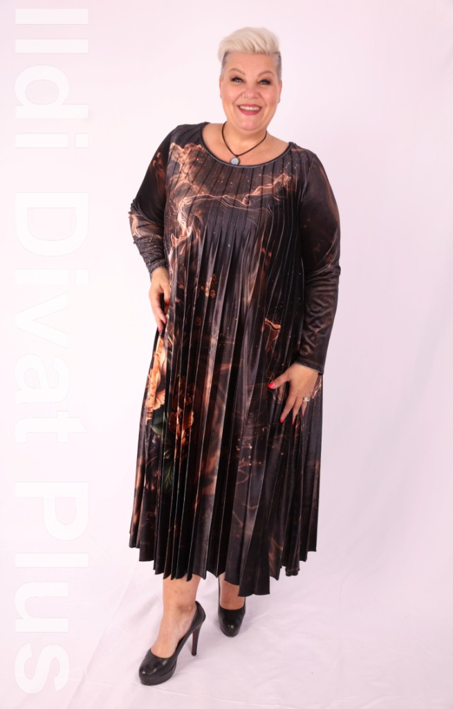 CN-G fekete-bronz mintás bársony anyagú rakott kerek nyakú ruha.