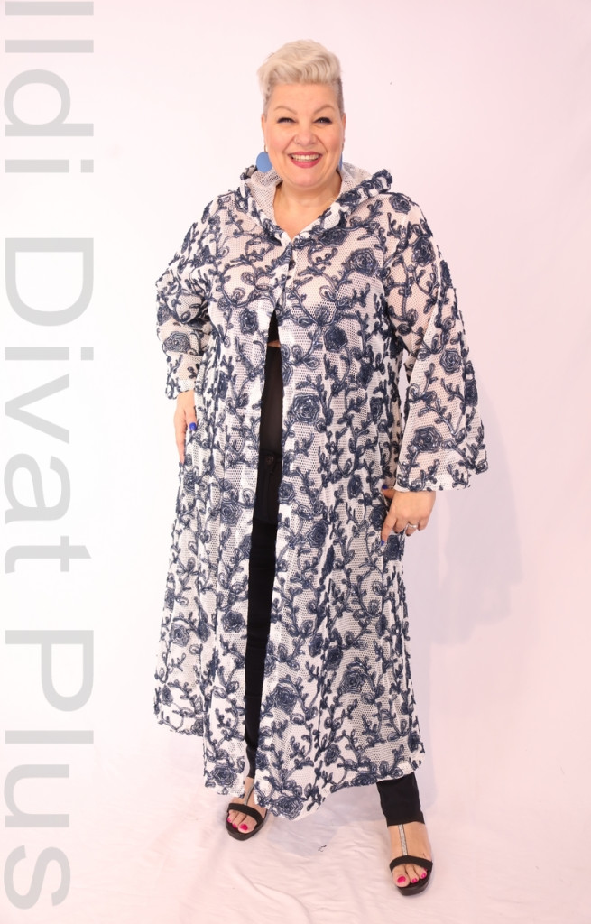 Darkwin fehér-kék flitteres virágos kapucnis hálós anyagú hosszított kardigán.