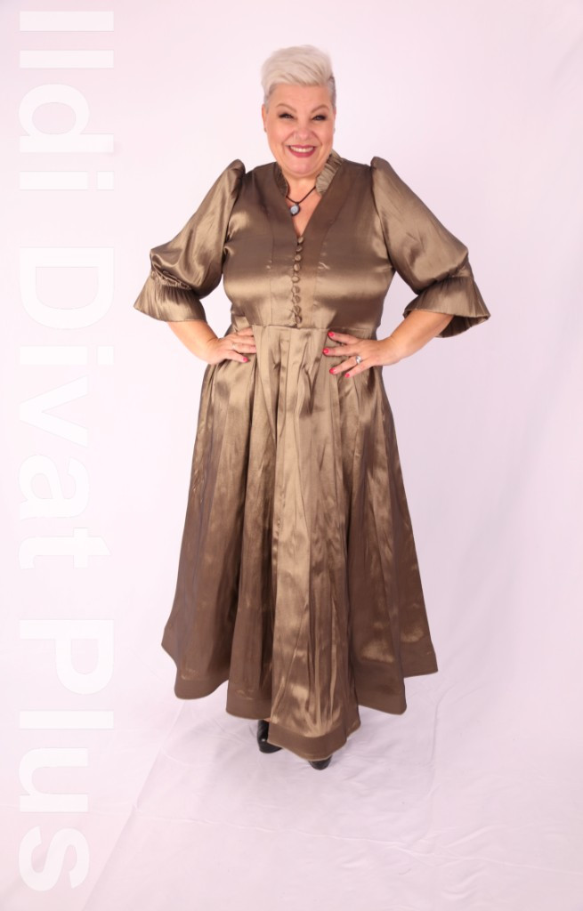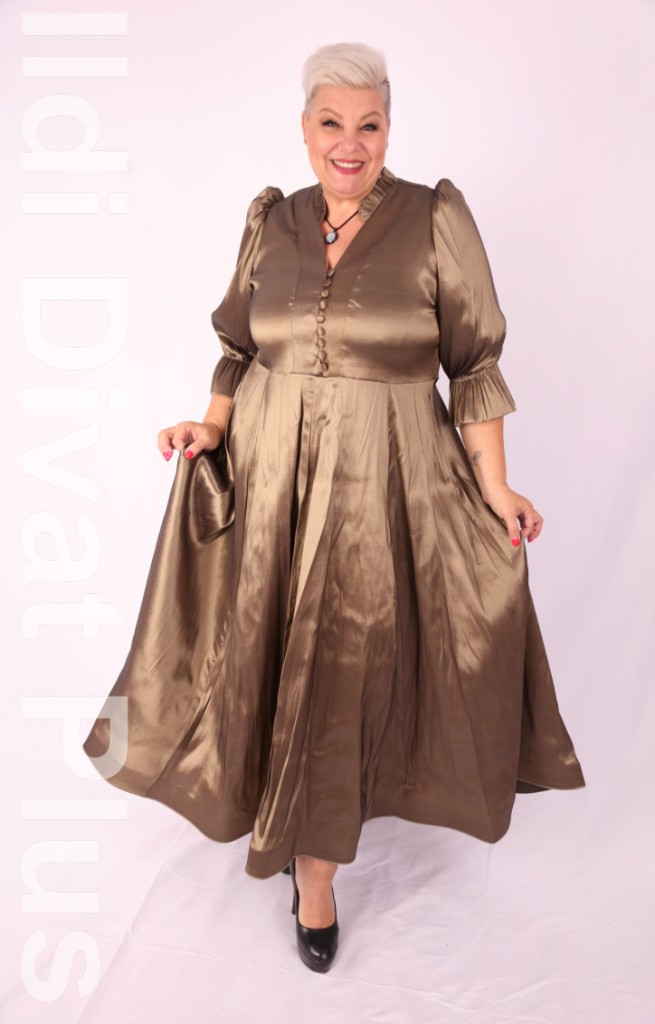 Darkwin bronz csillogós nyakán gombos derekán szabott ruha.