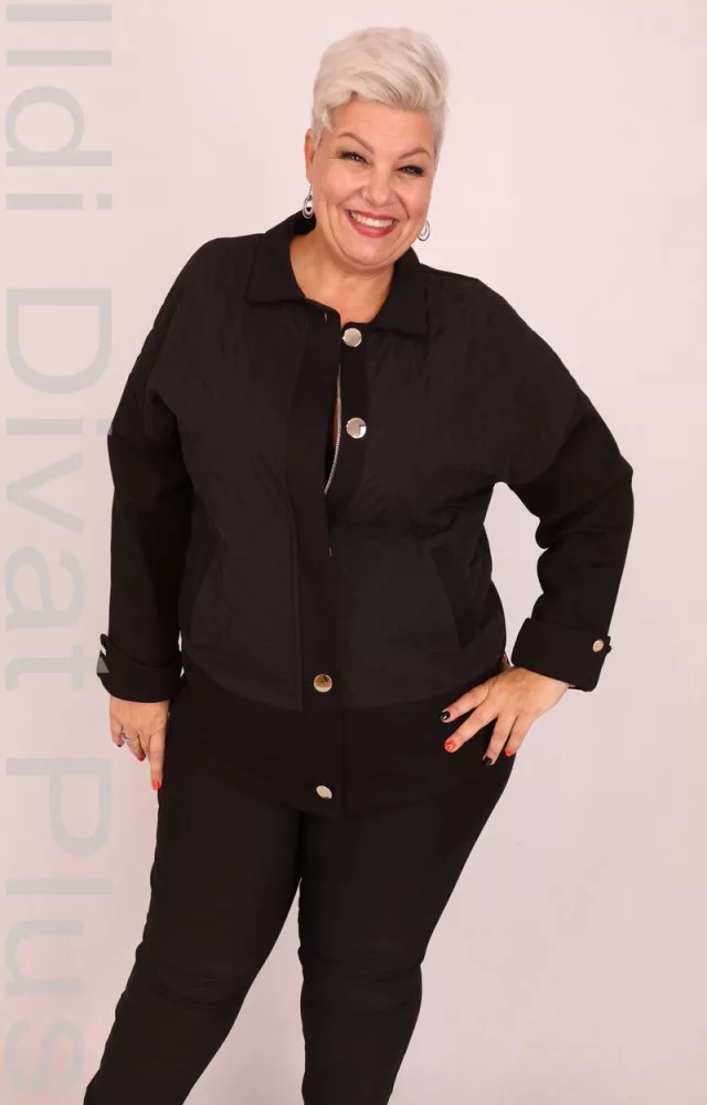 Fekete színű, galléros, cipzáras, patentos kabát.