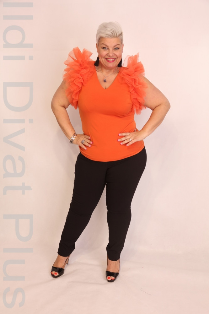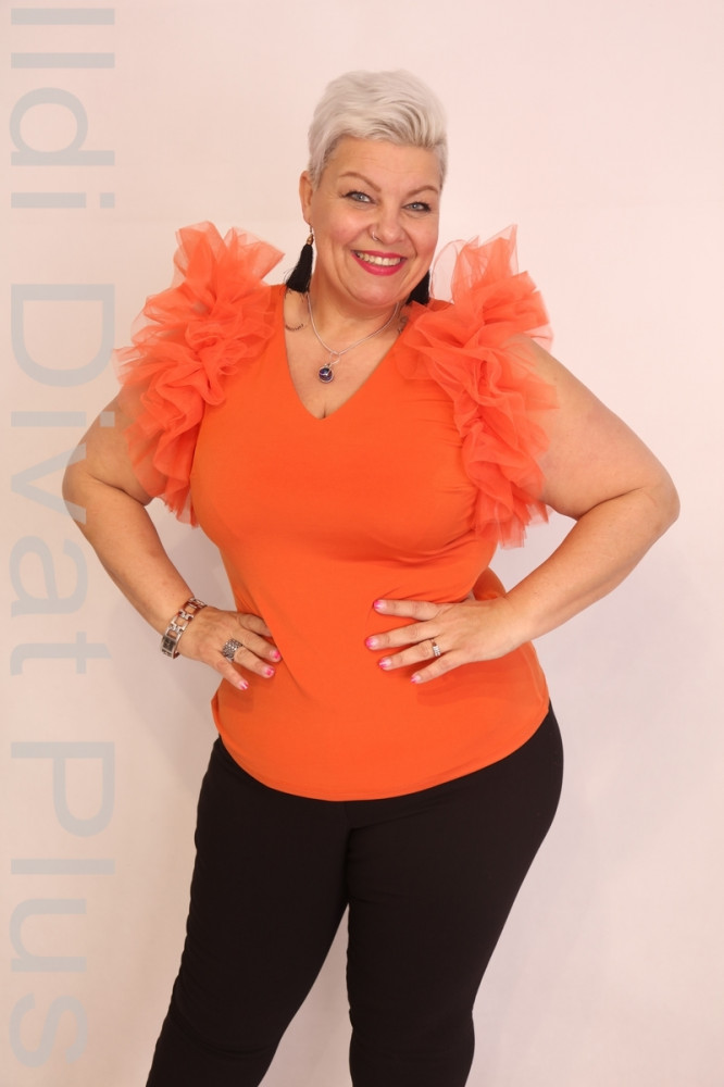 Explosion narancssárga színű, V-kivágott, ujján fdros, karcsúsított fazonú felső.