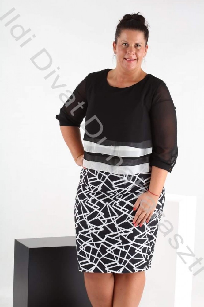 Silver fekete-fehér színű, kerek nyakú, felsőrészén muszlin rátétes, karcsúsított fazonú ruha.