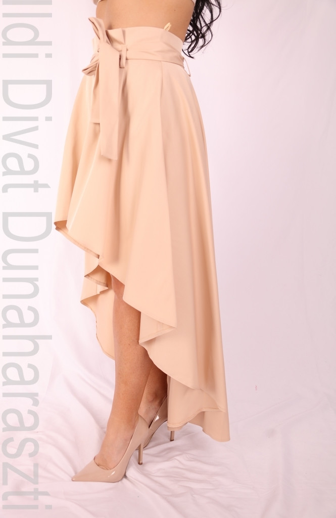Envy Fashion beige színű, elől rövid, hátul hosszú, kötős derekú szoknya.