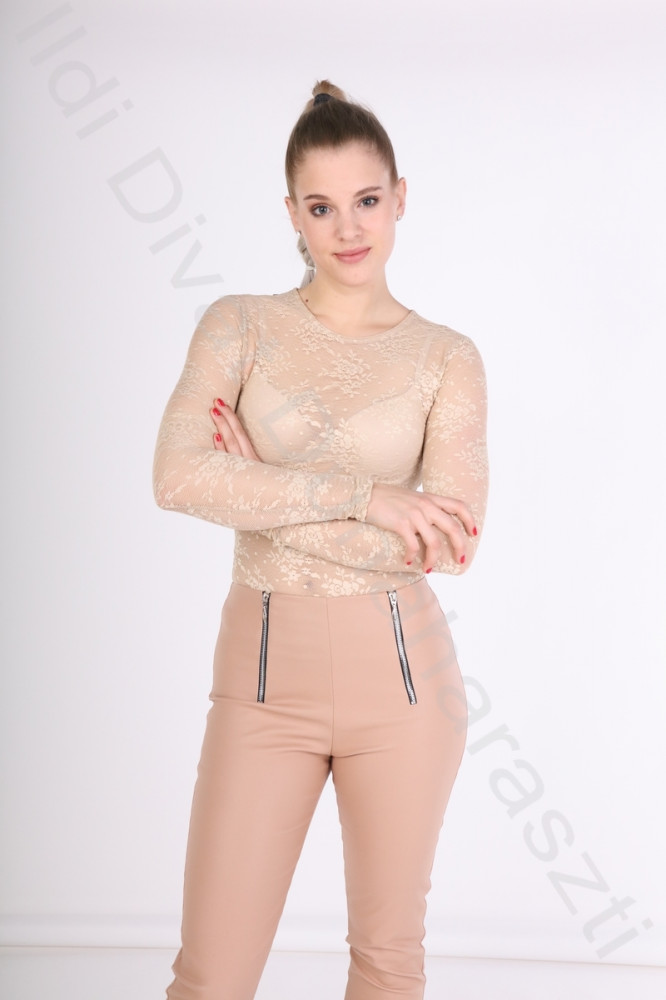 Envy Fashion bézs színű, átlátszó csipkés anyagú, karcsúsított fazonú felső.