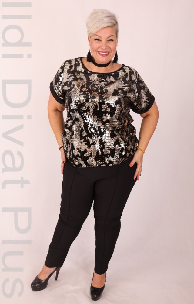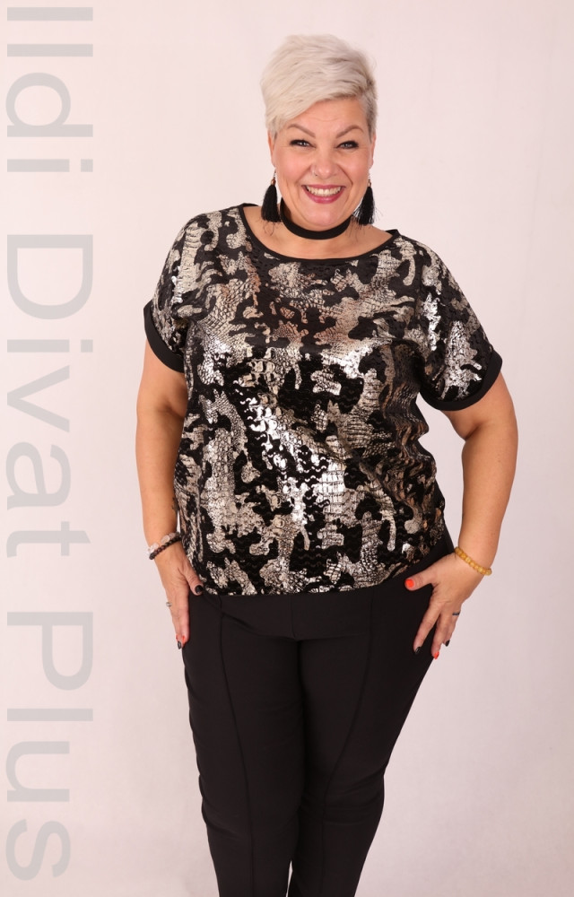 Frank Lyman elején fekete-arany mintás, fitteres, hátán egyszínű fekete, egyenes fazonő felső.